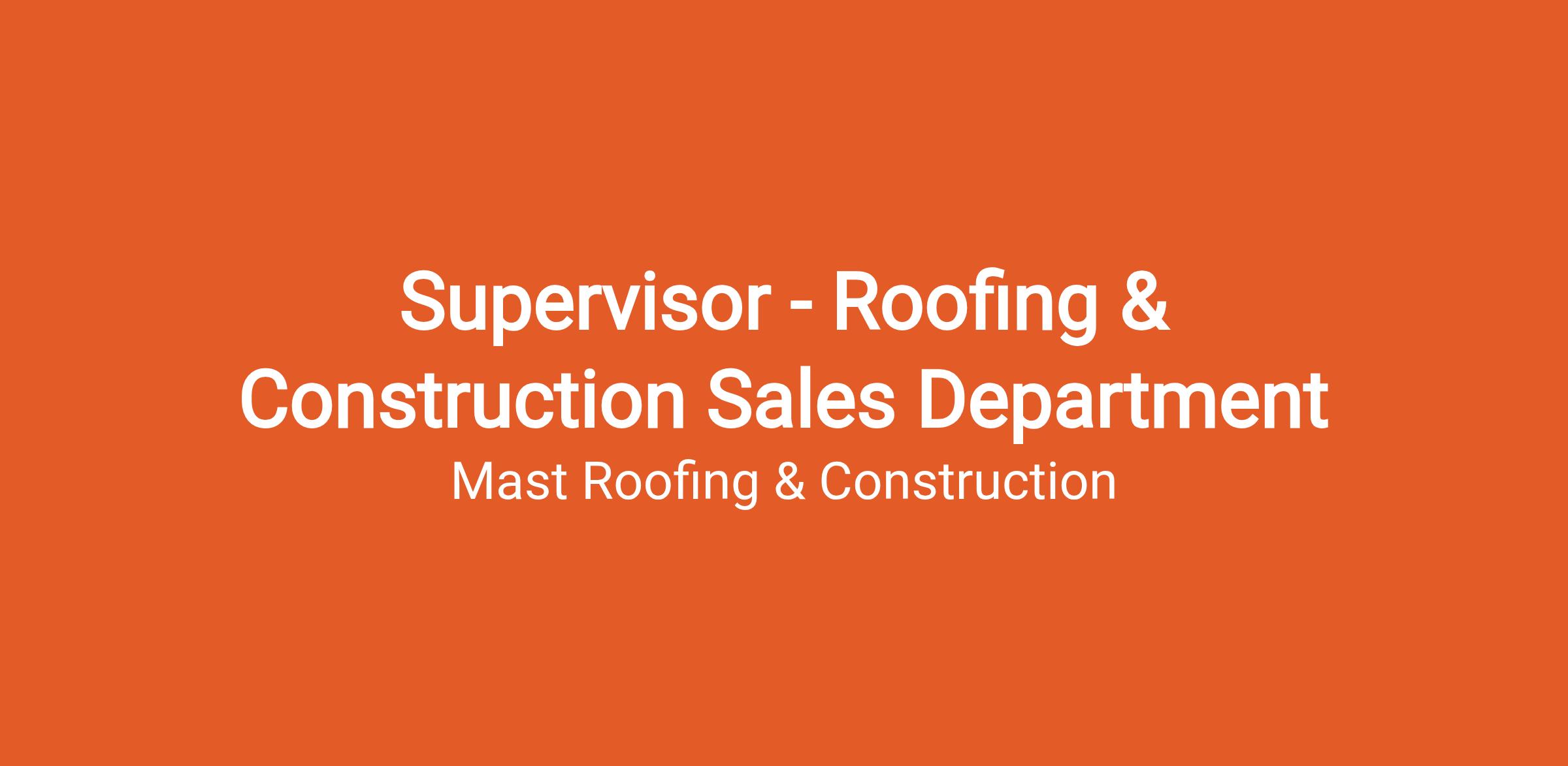 Mast Roofing & Construction in Oley, PA is hiring a full-time Supervisor - Roofing & Construction Sales Department to oversee and encourage success in our overall sales process. In this management position, your typical schedule will be Mon - Fri, 7:00 am - 5:00 pm plus some evenings and Saturdays as necessary with a 50-55-hour work week.